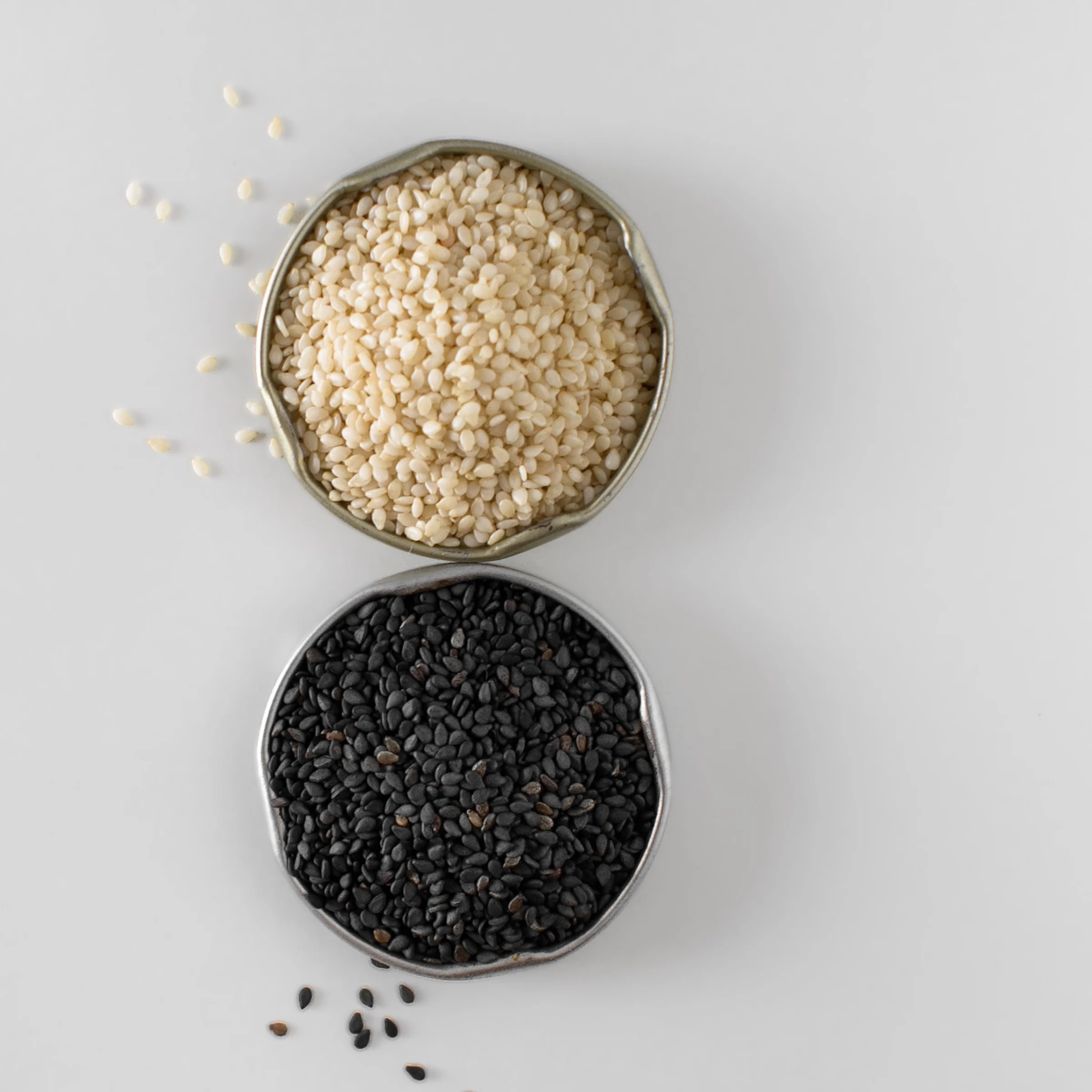 Sesame, or goma, is delicious when toasted and easy to find both at health food stores and wherever ingredients for sushi are sold. The black seeds owe their color to pigments in the fiber-rich outer seed coat. The white seeds come in both hull-free (“decorticated”) and hull-on varieties, with the former more delicate in flavor and texture and the latter more rugged and less prone to scorching. I’m currently stocking black sesame, for sprinkling onto light-colored foods and grinding into gomashio, as well as its finer-textured no-hull white cousin, for all other uses. Mix and match with different foods to find your favorite combinations. Keep in mind that sesame is oil-rich and prone to spoilage: buy small amounts and keep in a cool, dark place to preserve freshness.
