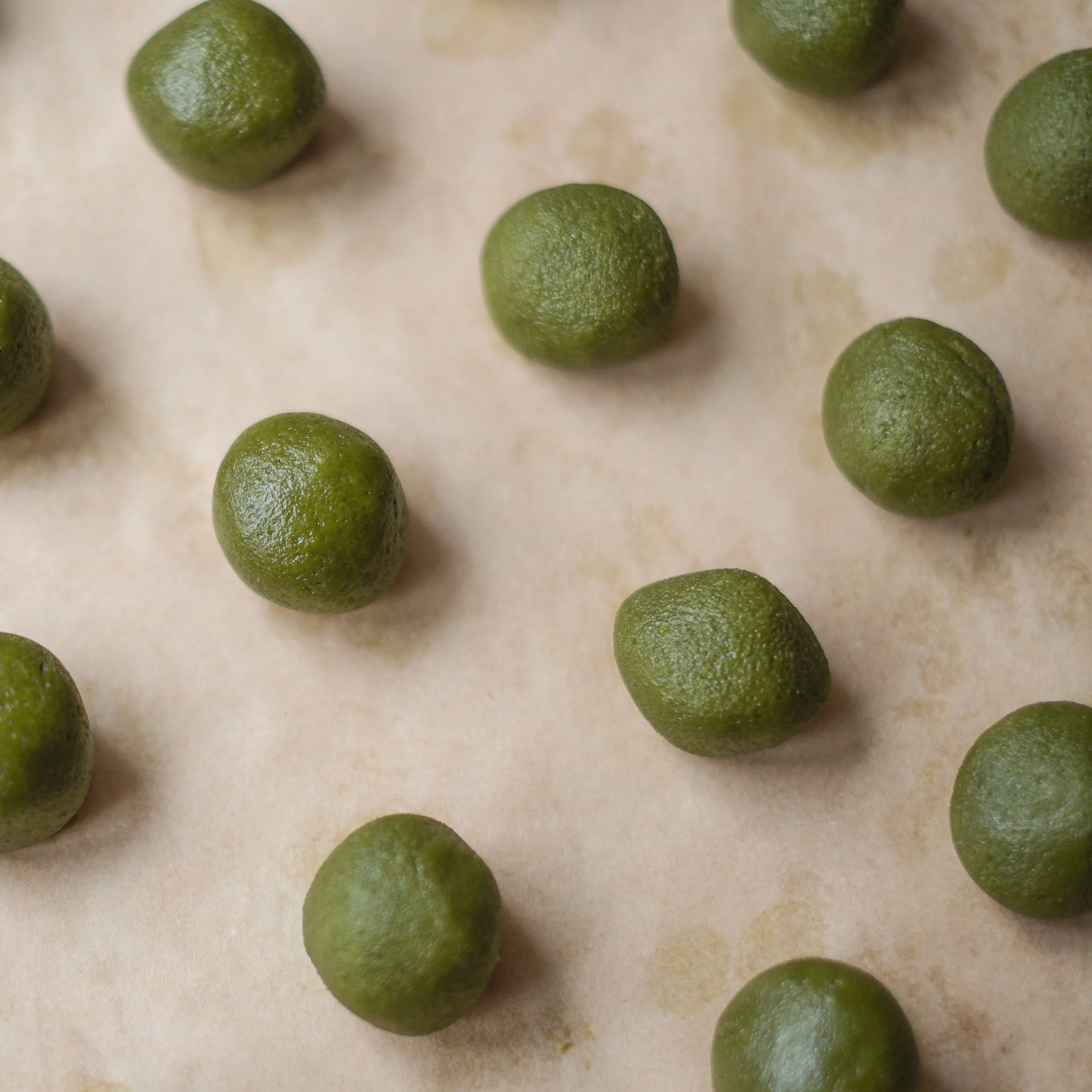 It’s easy. You whip the butter with the sugar and a lick of honey, then you beat in the egg. In a separate bowl you sift together the flour, matcha, salt, and soda. Next you add the dry ingredients to the wet and stir until combined. That’s it. All that’s left is the shaping and the baking (eleven minutes for me, with my oven thermometer showing 175°, no fan).