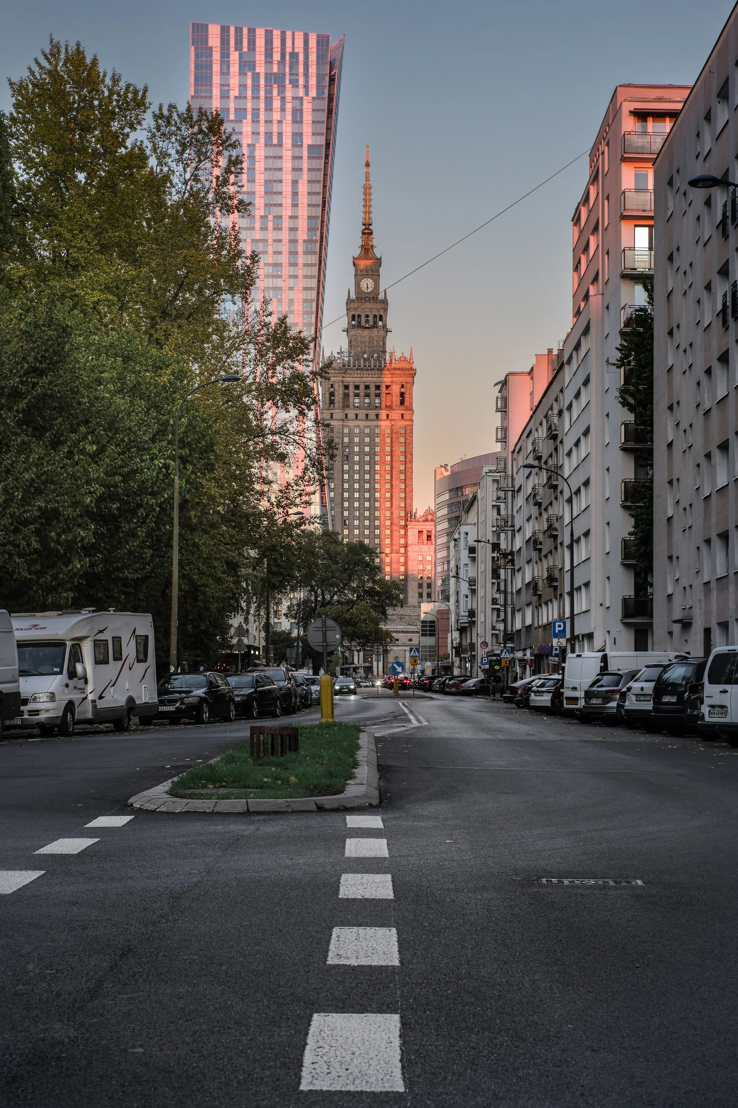 Five-thirty in the afternoon in mid-to-late October turns out to be the perfect time to contemplate the Palace of Culture, that contentious beacon of our nation’s past, especially from a vantage point in the middle of the road near the western terminus of Złota, a quaint-but-gritty street with a lovely name. Our city’s Stalinist crown jewel reveals itself as divisible, after all—precisely, unequally, and non-rectilinearly so, into one section bathed in the warm radiance of the setting sun and a much larger one darkened by the arc-edged shadow of this deconstructivist Liebeskind highrise.