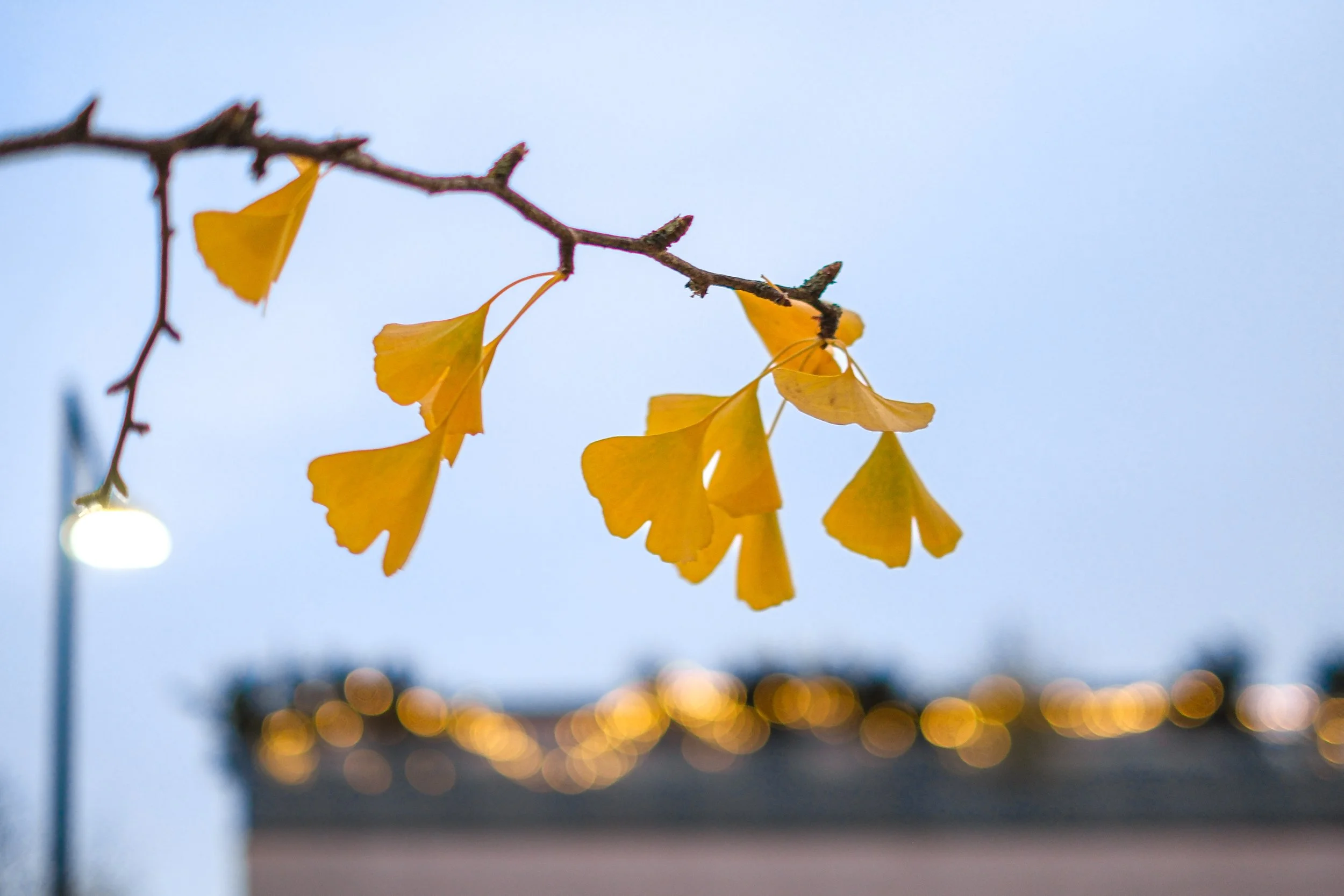 I’m not sure when I noticed the similarity between those ginkgo leaves near me and that string of lights flanking a mid-size building across the street, but it surprised me when I did and I remember being skeptical as to whether I could convey this complementary contrast in a photo. The effort was not just conceptual but also physical—composing the shot and getting the angles I wanted required that I stand on tip-toe, attain an archer’s balance, lock down that tricky framing, hand-hold that longer exposure.